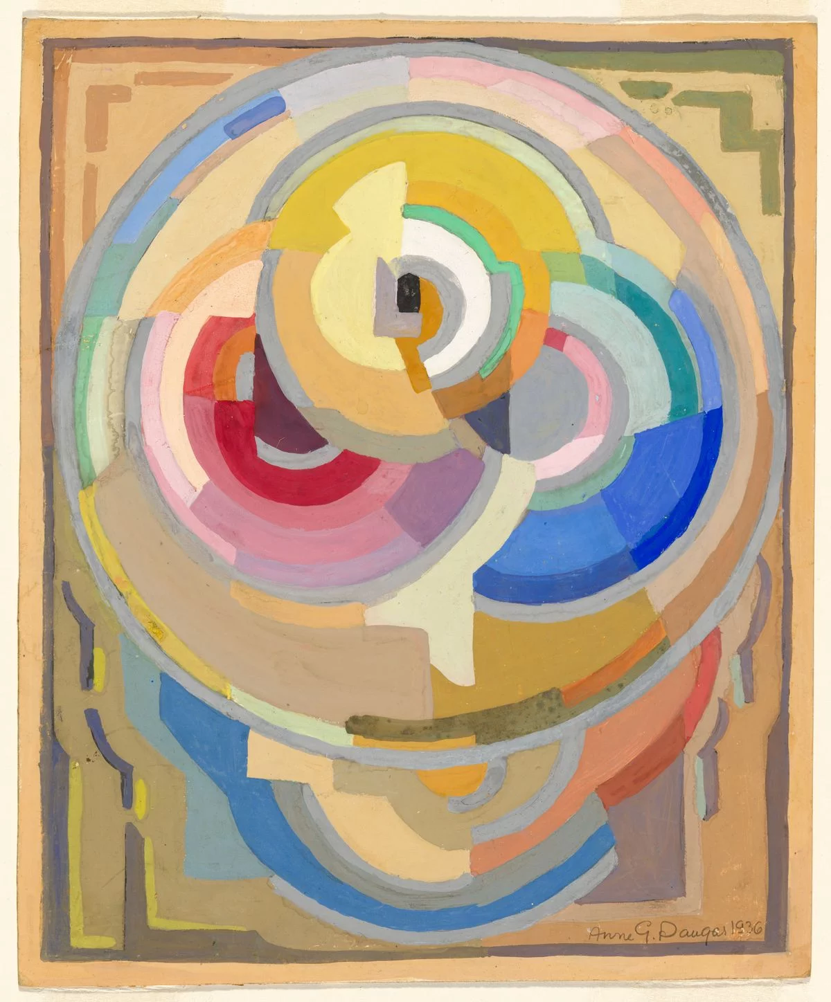 Dangar’s courageous spirit reemerged in 1930 when she connected with Albert Gleizes, a key figure in Cubism. Gleizes’ ideas around translation and rotation in Cubism – concepts he believed represented the cyclical nature of time – captivated Dangar and influenced much of her later work. When Gleizes invited Dangar to return to France live as part of his artist community Moly-Sabata in Sablons, a small town nestled beside the Rhone River, she accepted without question.