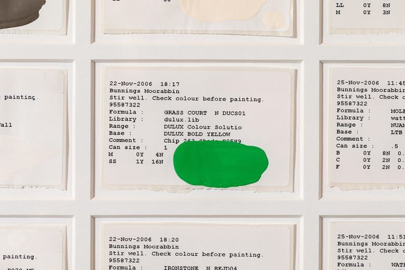 Exploring the semiotics and aesthetics of a retail workplace, Mixed Emotions consists of 2,157 labels that adhere to commercially sold tins of paint, indicating the colour mix, ingredients and date and time of mixing.