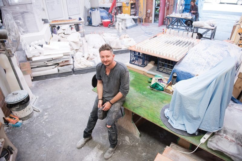 Alex Seton is known for his marble sculptures. These carved stone works often mimic the soft folds of fabric, but they have a hard political edge.