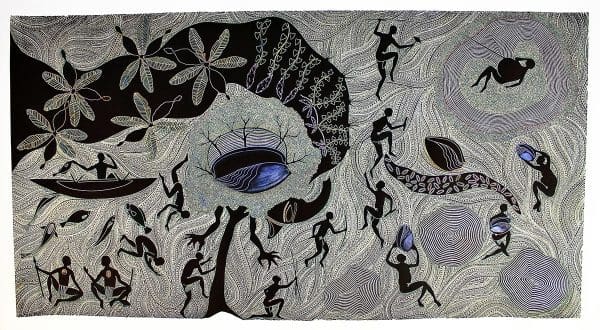 Cairns-based artist Daniel O’Shane has won the National Works on Paper Prize with his piece Aib Ene Zogo ni Pat (Story of Aib and the sacred waterhole).