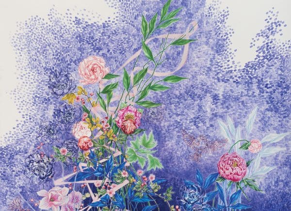 At first glance, Susanne Kerr’s large gouache paintings of delicate floral arrangements convey lightness and whimsy—but something else is going on under the surface.