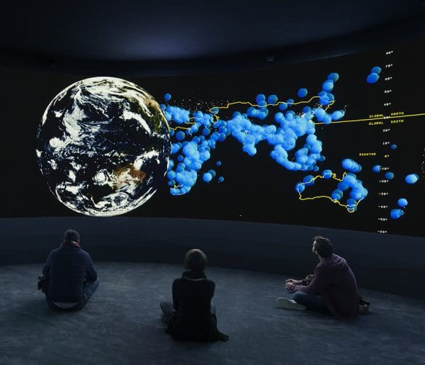 Based on an idea by French philosopher Paul Virilio, EXIT draws on a quarter of a century’s worth of scientific data to vividly animate the world’s hot spots of deforestation, rising seas and mass migration as a result of global warming.