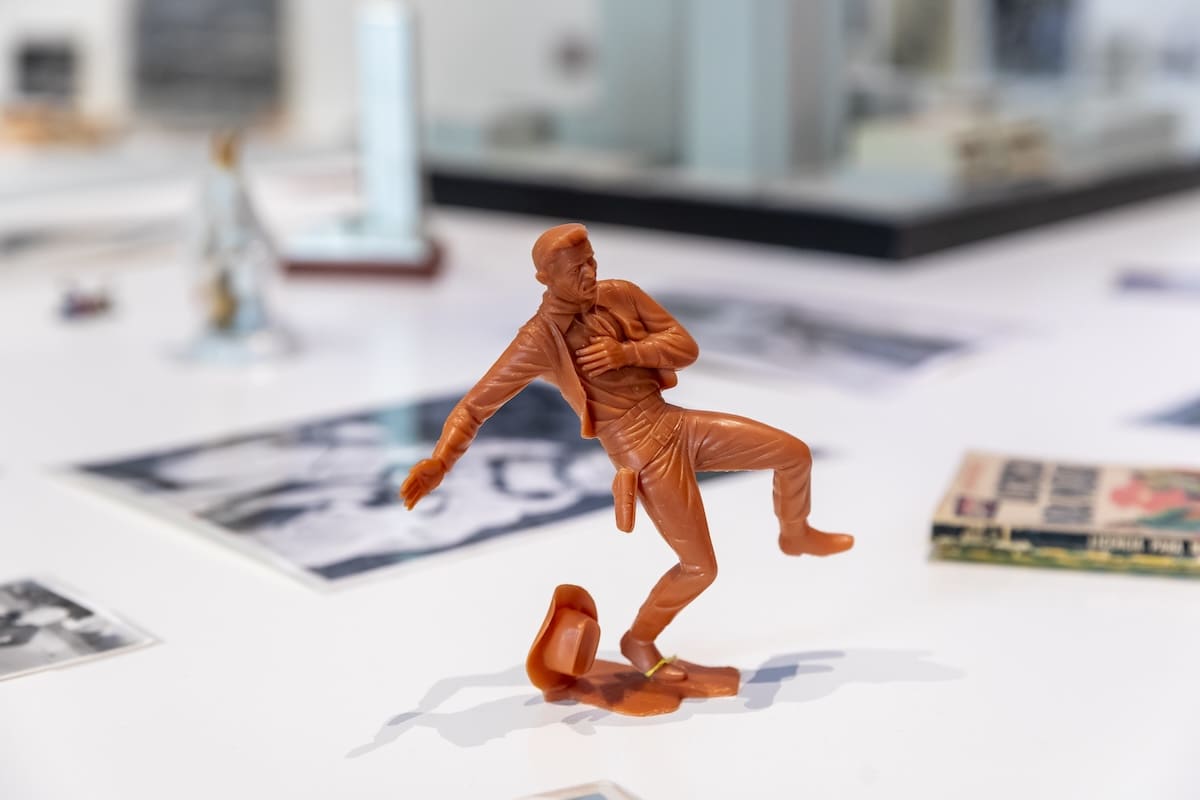 Not only is he billed as the curator of his own exhibition, but quite appropriately he has penned the catalogue essay. Like the installation itself, it is outwardly small. Its dimensions are similar to a CD case. Yet, to continue the Dr Who comparison (with a bit of Whitman and Bob Dylan thrown in), it contains multitudes. There are animals, film stars, rock musicians (Nick Cave), paperbacks (All That Fall by Samuel Beckett) and famous tourist sites (The Leaning Tower of Pisa), all classified by displaying different aspects of the word “Falling”.