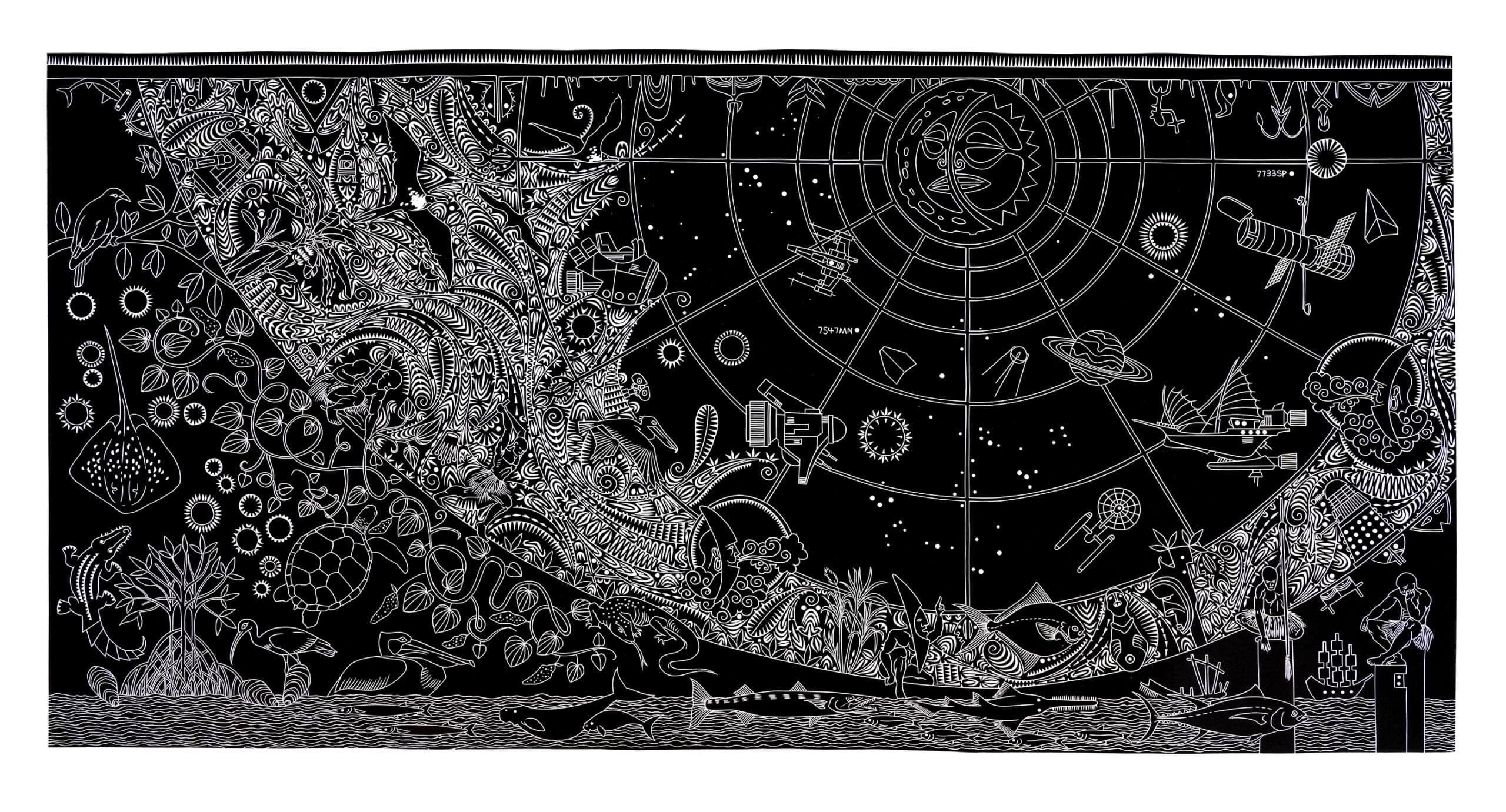 The artworks act as allegories for the kinship systems they come from, echoing the fluidity and expansiveness of water. Carmichael explains, “Kinship systems relate to ways of being in the world, guiding responsibilities for each other, the environment and Country.” The artworks, artists and communities involved reflect wider ideas of reciprocity. The notion of reciprocity can be used to describe water from a First Nations perspective: that which provides, encompasses, holds, carries, and connects.