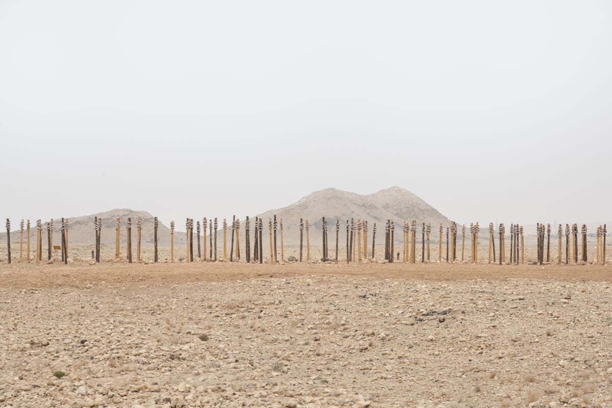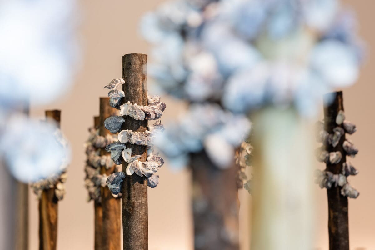 The exhibition offers expansive and personal experiences of ecological change and its impact. A video work from Jilamara Arts sees 30 artists perform their totems. Carmichael explains, “Through these totemic systems, different parts work together to support ecological balance.” Brian Robertson’s linocut illustrates connections between Country, culture and people. Megan Cope’s oyster-poles draw attention to the cultural and ecological significance of oyster reefs. Lucy Simpson’s installation highlights the vital role of freshwater mussels in culture and water protection. In response to mismanagement of water in the Murray River and its tributaries, Nici Cumpston brings attention to the history of conversations between this water site and her people. Respectively referencing marine plastics and ghost nets, Solomon Booth and artists from Numbulwar Numburindi Arts talk to the increasing pollution in our oceans. Carmichael presents diverse works encoded with cultural memory that play “powerful roles in how we care for water sites across the continent.”