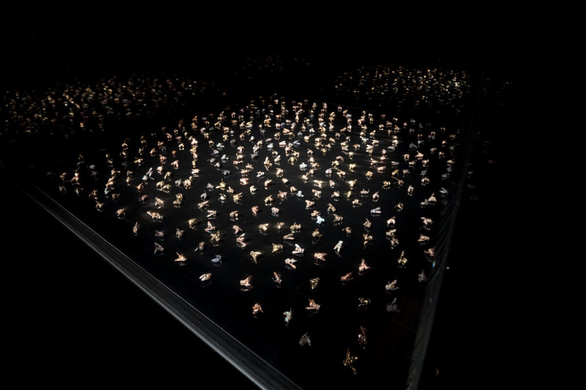 Amy Perejuan-Capone has been producing large-scale sculptures as part of an ongoing research project reflecting her father’s aviation experience. Melville Contemporary allowed Perejuan-Capone to continue this research at a smaller scale. Working with donated dead bees and electroforming processes, the artist has coated bees in gold and copper and presented them in a darkened space. There are 365 bees, representing the duration of a western calendar. The work can be seen as a commentary on mining, extraction and climate change. The still bees allude to a sense of the stilling of nature at the hands of humans.