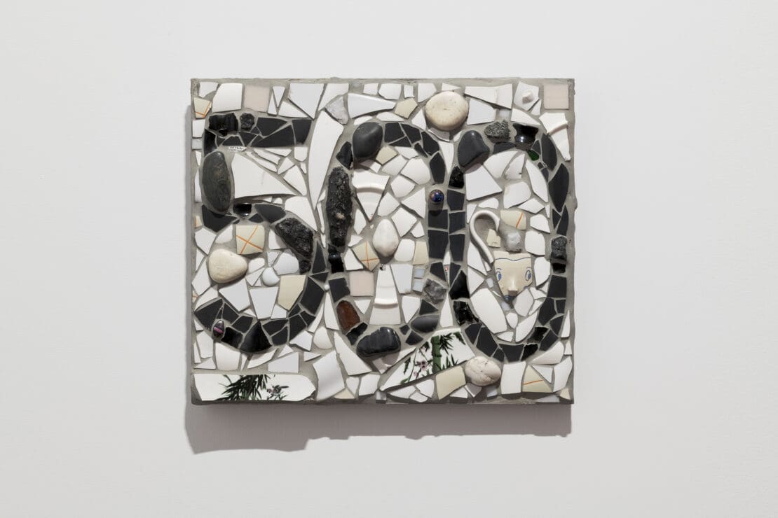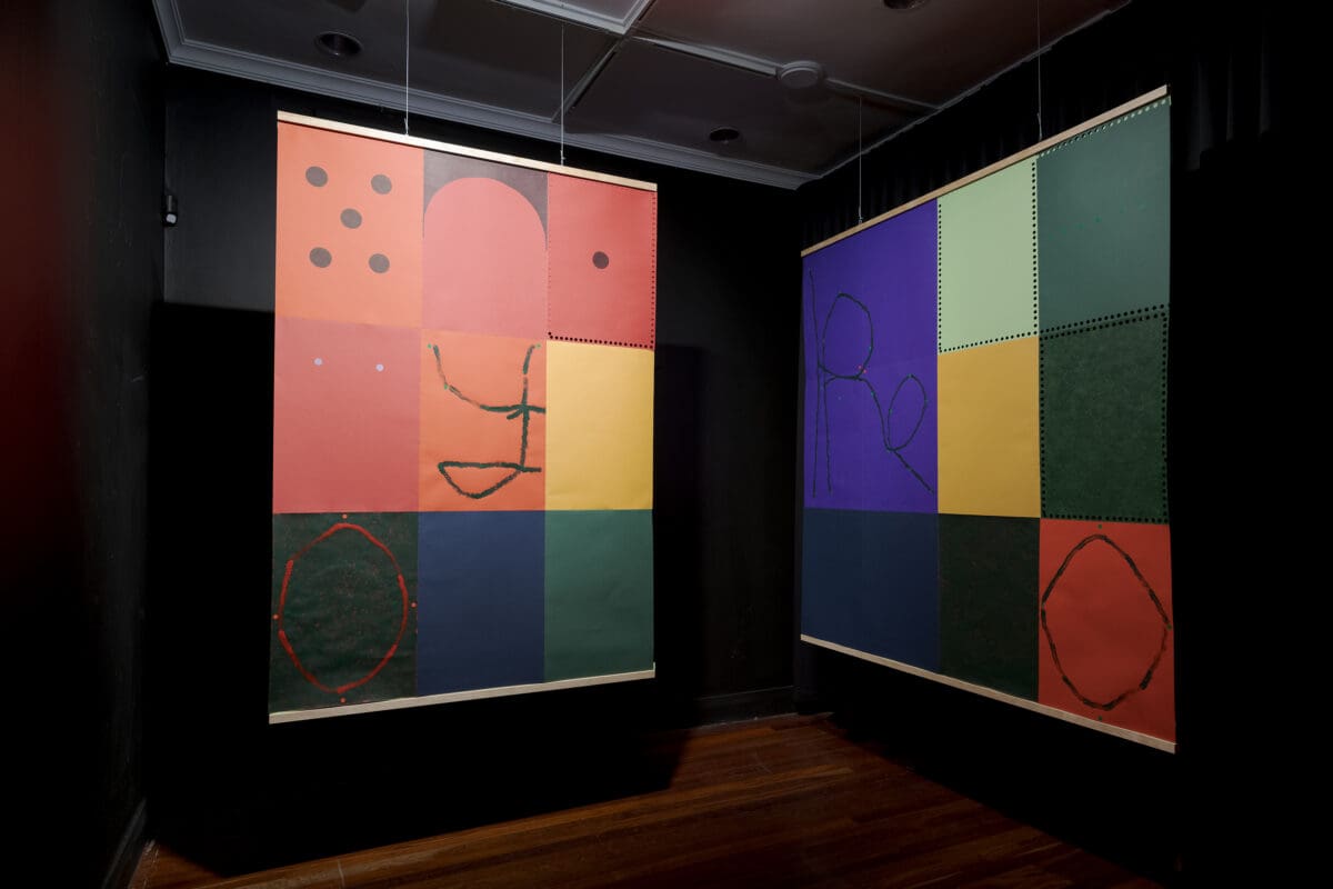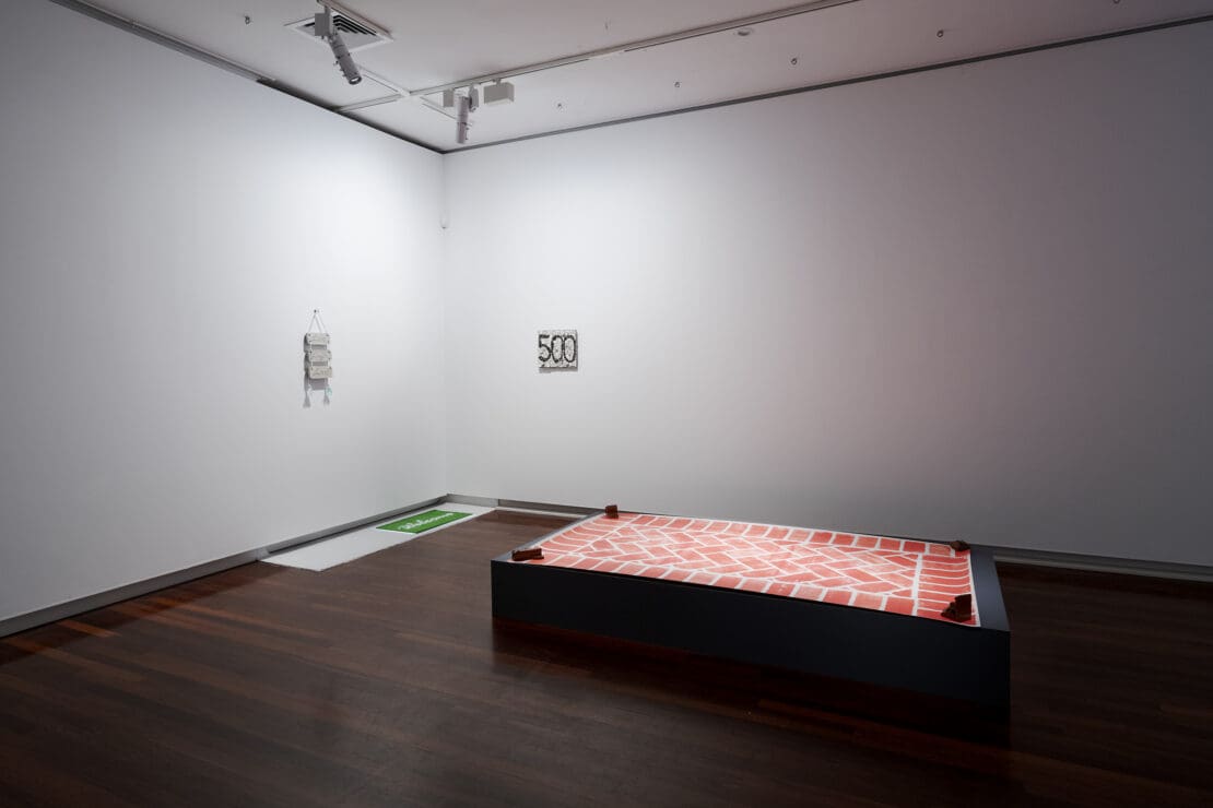 Andrew Varano, an alumni artist of Goolugatup, presents a colourful mixed-media installation, Numbers and numbers. In Boye’s words, “Varano is interested in thinking and learning about language. Through formal arranged gestures in space, Varrano considers how adults can re-learn, despite being within a world of neoliberal corporate language.”