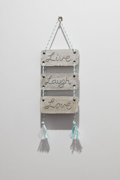 Lewi, well known for their investigations of suburban paranoia and day-to-day mundanity, produces work based on their neighbourhood dérives. They are interested in the mundane aspects of newer-growth suburbs. The works exhibited reference when Lewi scrawled the words, ‘live laugh love’ into wet concrete in front of a new house and was fined $500.00. The work considers the notion of being punished within constructed suburban environments.
