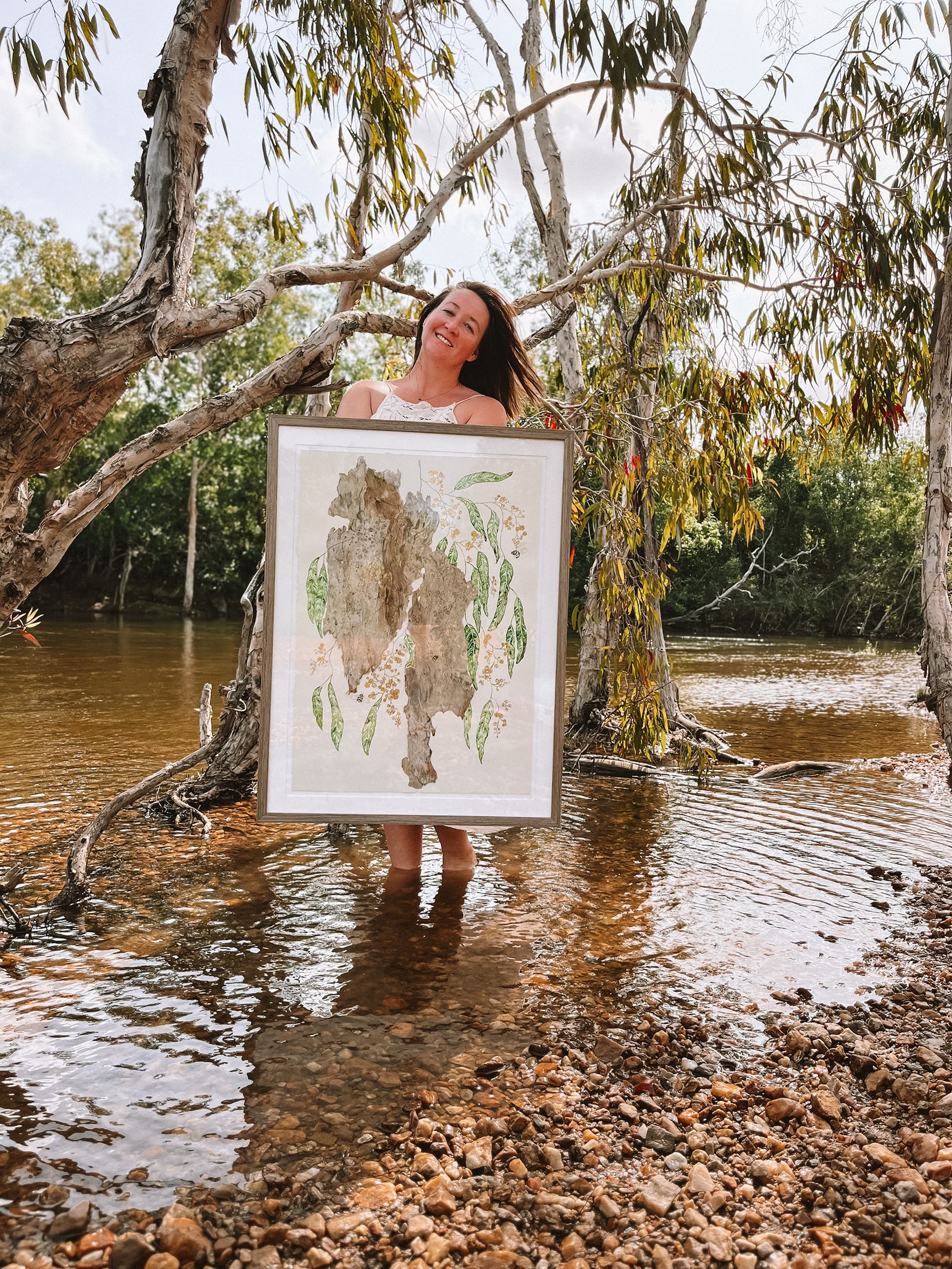 The paperbark tree is an Australian mainstay. Popular with native wildlife and resistant to drought, many grow throughout Darwin, where Hunnah James currently lives and works. “Paperbarks have this shedding that’s quite symbolic of what we go through [as humans], shedding off our layers over the years,” says James, who has incorporated the bark as a material into her work, layering it among watercolour paintings of Australian flora and fauna—from banksias and wattles to zebra finches, with common crow butterflies fluttering among Geraldton wax flowers.