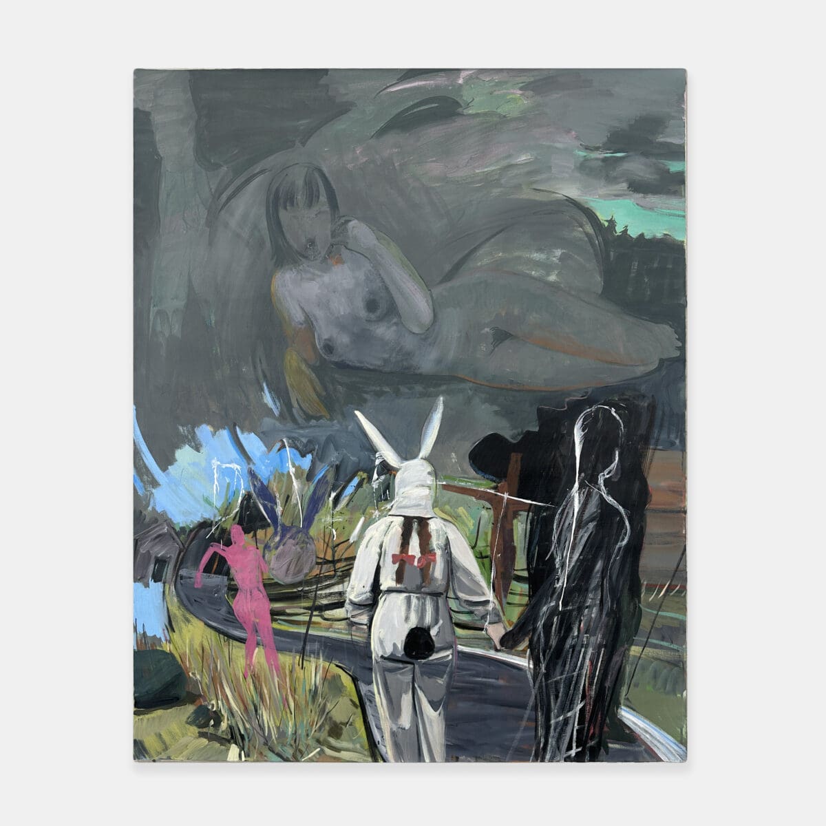 Christine Burgon’s paintings hum with their own enigmatic energy. “I start paintings without much of a strategy and sit alone staring at the same thing for a long time until it starts to change,” she tells me. “The variety and versatility come from that initial improvisational approach, by turns tender and prurient.” Made during a particularly cold summer in her home in northern Minnesota, Burgon’s two new works for the show oscillate between the idyllic and the intrusive. “The nights are very dark, and the nature is quite feral. Often the serene beauty can feel cut across by intrusive thoughts,” she reflects. The resulting gestural, layered imagery sees a cast of figures and forms drift across abstracted landscapes, folding interior and exterior worlds into one.