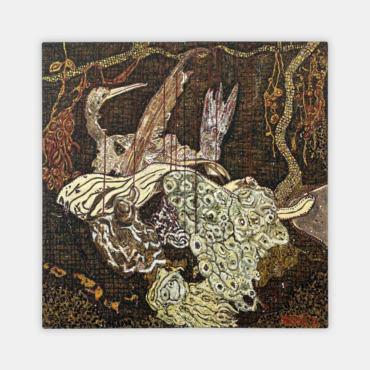 Josey Kidd-Crowe and Suzanne Archer anchor the exhibition’s spectrum. Kidd-Crowe’s paintings, one text-based and one abstract, are lifted from his recent show Sense Units and continue his investigations into language as image and image as thought. Archer’s monumental Beachcombing South Coast (2023)—a two-metre by two-metre painting drawn from her surroundings—offers a grounding counterpoint, the esteemed senior artist’s dense, earthy brushwork reflecting time and place.
