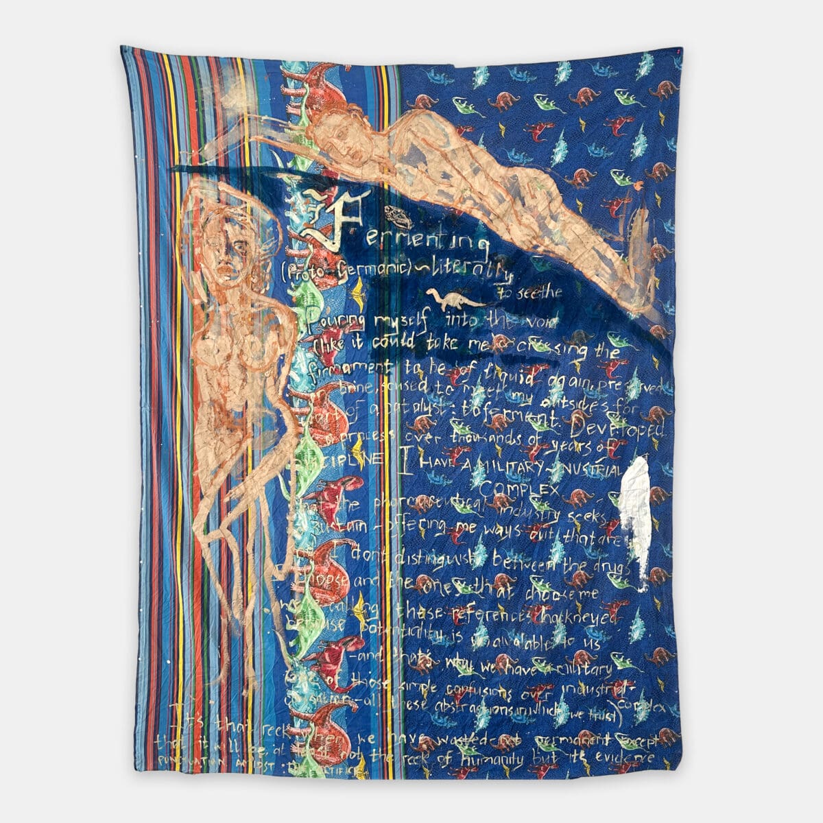 That fluidity of gesture carries through the exhibition, where experimentation often begins with the materials themselves. Zoë Marni Robertson’s protest banners, painted on second-hand bedsheets with the op-shop tags still attached, explore labour, economy, support and resistance. There’s an immediacy and rawness to their making—half the work is already there, half urgently asserted.