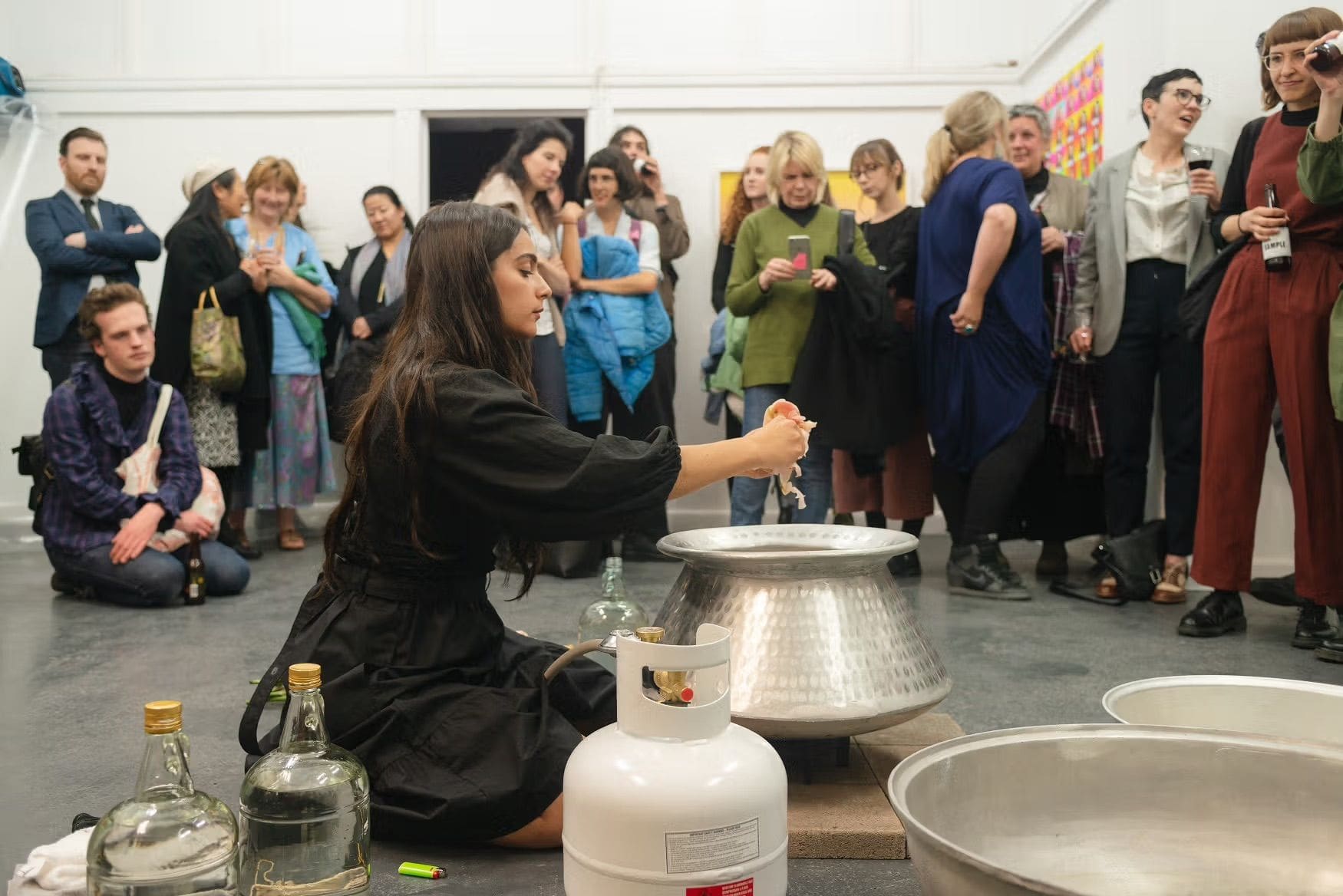 Justine Youssef has also used food to explore difficult topics. At Meet Me At The Table at Sydney’s Western Terrace last year, she demonstrated an ancestral rosewater-making process from her family’s village in the mountains of Lebanon. The performance is based on an earlier work, an other’s Wurud (2017). Instead of distilling rosewater with flowers native to Lebanon, as is tradition, she uses what’s available in Australia: introduced species that “subjugate native land and imitate British pastoral fields”, Youssef says. Participants were served knafeh desserts made with rosewater and the “next artist presented similarly on food and occupation”. When she staged an earlier iteration of this work at Sydney’s 4A Contemporary Asian Art, the program featured a Lebanese breakfast—a chance to discuss the artwork with olives, labne and za’atar manoushe.