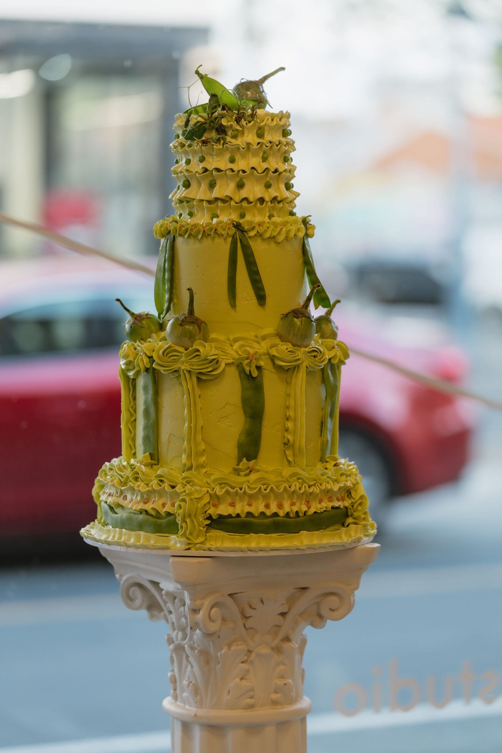 Bringing food into a gallery can trigger responses far beyond the frame. Libby Haines’ Table Manners did this at Melbourne’s A-N Studio last spring. “She’d made candelabras out of meringue and this huge cabbage sculpture,” Lefebvre says. “At the end of the night, she’s like, ‘Oh my God, it’s going to be warm overnight. There’s going to be people in here tomorrow and it’s going to smell terrible!’” Luckily, “nothing fermented”—unlike Dieter Roth’s Staple Cheese (A Race) which was exhibited at Eugenia Butler’s Los Angeles gallery in 1970. The artist’s 37 suitcases of rotting cheese succumbed to flies and maggots and was shut down by health inspectors.