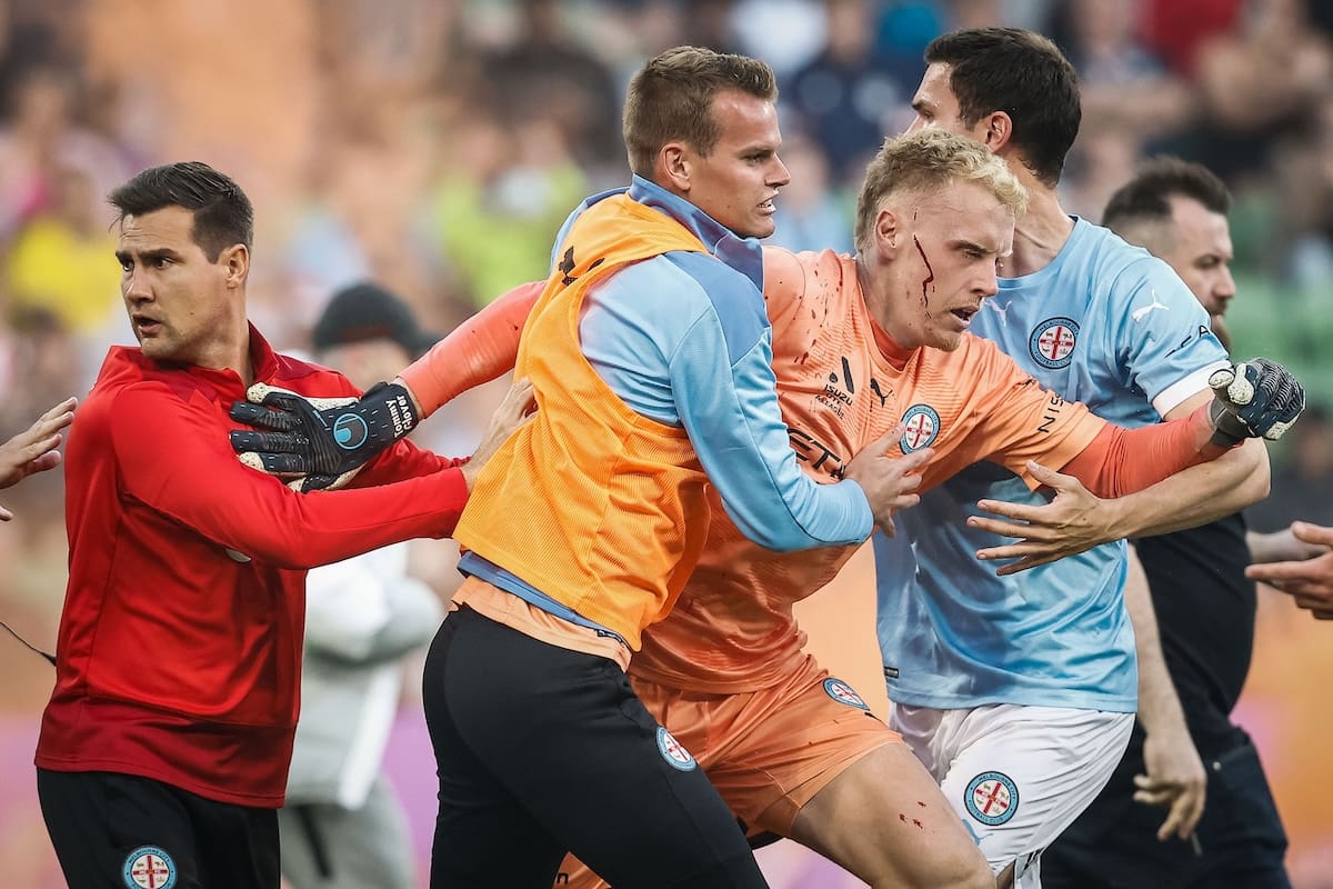 Darrian Traynor, Freelance/Getty Images, ‘A Dark Day’. Melbourne City goalkeeper Tom Glover, shocked and bleeding, is escorted from the pitch by teammates.