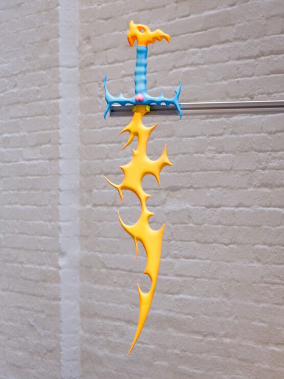 Within Tender Comrade, I have been most captivated by how the use of partitions, scale, and texture in modes of display have encouraged this. When you enter the show, floor-to-ceiling panels keep works on the ground floor hidden except for a fraction of Xia Han’s inflatable sculpture Humiliation (2022-2023) through what Xia describes as a rat hole. Through this and alternative entries created by the gallery, Shang Liang’s Boxing Man No.4 (2019), installed close to the ceiling leads audiences into an expanded viewing of the work.