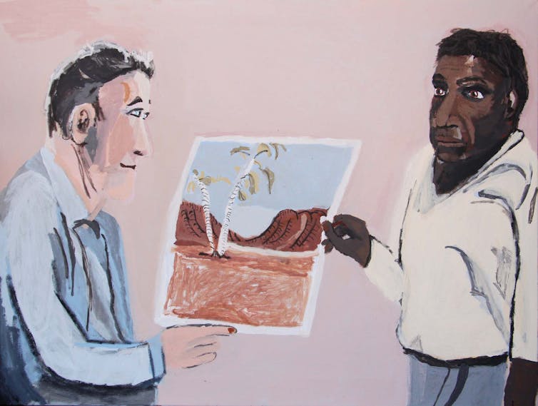 Vincent Namatjira’s rendition of this event, in which the transaction is one of cultural exchange, is a painting of equals.