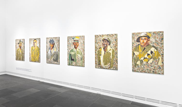 That assertiveness extends to correcting the historical record in his series of Unknown soldiers (2020) which portrays First Nations men who served in the first world war. Many chose not to declare their Aboriginal heritage so they could enlist. The paintings completed on army surplus camouflage fabric reinforce that their stories are still hidden, waiting to be woven into an inclusive national history.