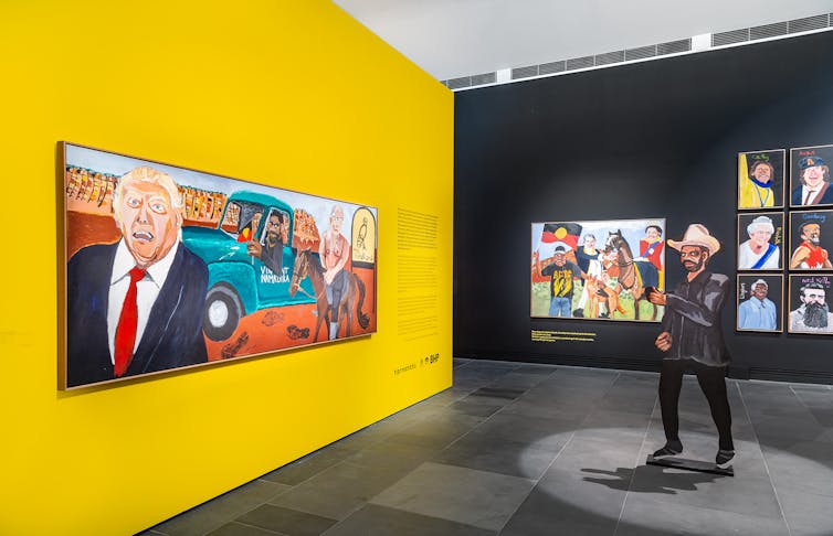 That engagement with art history extends to constructions of national art. In place of bucolic pastoral scenes of settled land – minus its Indigenous inhabitants – by artists such as Arthur Streeton are new national pictures such as Albert Namatjira, Slim Dusty and Archie Roach on Country (2022).